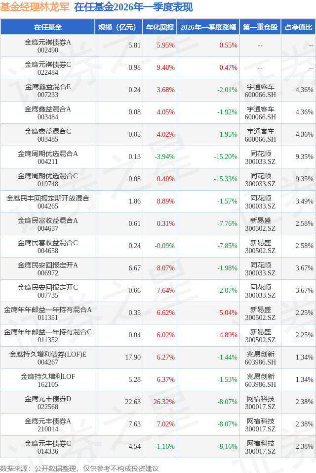 证券之星消息,日前金鹰元丰债券C基金公布一季报,2026年一季度最新规模4.54亿元,季度净值涨幅为-8.16%。
