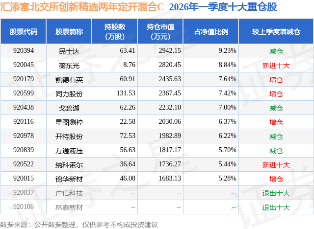 从基金规模来看,汇添富北交所创新精选两年定开混合C基金2026年一季度公布的基金规模为0.48亿元,较上一期规模5640.73万元变化了-797.04万元,环比变化了-14.13%。该基金最新一期资产配置为:股票占净值比89.84%,无债券类资产,现金占净值比10.3%。从基金持仓来看,该基金当季前十大股票仓位达69.14%,第一大重仓股为民士达(920394),持仓占比为9.23%。