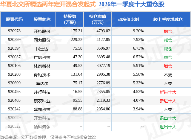 从基金规模来看,华夏北交所精选两年定开混合发起式基金2026年一季度公布的基金规模为5.21亿元,较上一期规模5.26亿元变化了-500.64万元,环比变化了-0.95%。该基金最新一期资产配置为:股票占净值比97.63%,无债券类资产,现金占净值比4.03%。从基金持仓来看,该基金当季前十大股票仓位达59.72%,第一大重仓股为开特股份(920978),持仓占比为9.2%。