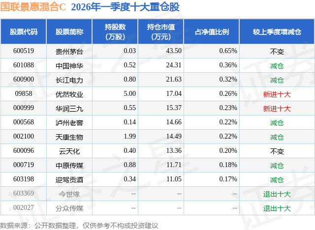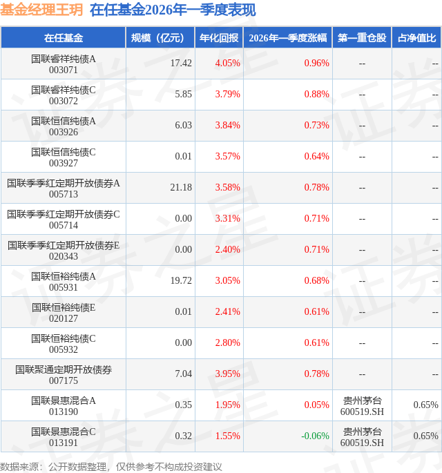 证券之星消息,日前国联景惠混合C基金公布一季报,2026年一季度最新规模0.32亿元,季度净值涨幅为-0.06%。