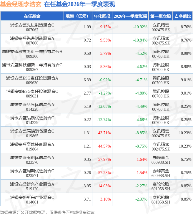 证券之星消息,日前浦银安盛新兴产业混合C基金公布一季报,2026年一季度最新规模3.71亿元,季度净值涨幅为-2.37%。