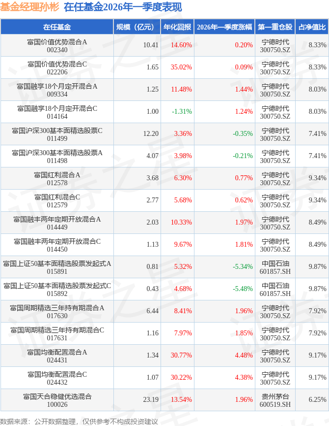 从基金规模来看,富国融享18个月定开混合C基金2026年一季度公布的基金规模为1.0亿元,较上一期规模1.1亿元变化了-1015.91万元,环比变化了-9.2%。该基金最新一期资产配置为:股票占净值比93.88%,无债券类资产,现金占净值比6.32%。从基金持仓来看,该基金当季前十大股票仓位达40.21%,第一大重仓股为宁德时代(300750),持仓占比为8.03%。