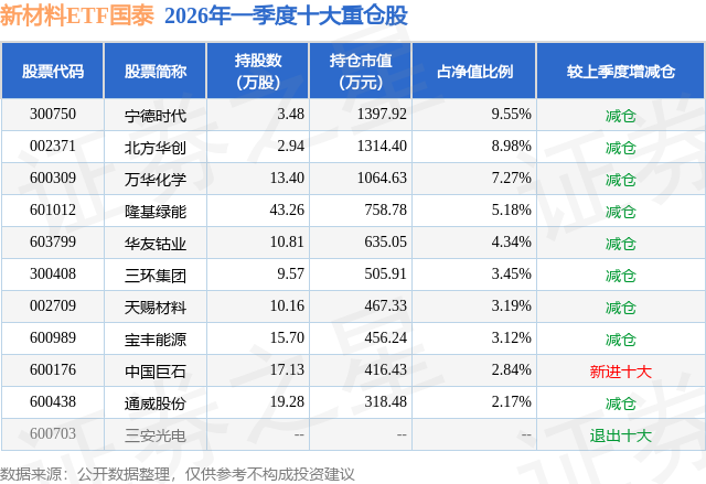 从基金规模来看,新材料ETF国泰基金2026年一季度公布的基金规模为1.46亿元,较上一期规模1.64亿元变化了-1771.62万元,环比变化了-10.79%。该基金最新一期资产配置为:股票占净值比99.26%,无债券类资产,现金占净值比0.76%。从基金持仓来看,该基金当季前十大股票仓位达50.09%,第一大重仓股为宁德时代(300750),持仓占比为9.55%。