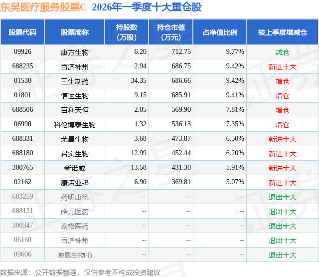 证券之星消息,日前东吴医疗服务股票C基金公布一季报,2026年一季度最新规模0.33亿元,季度净值涨幅为0.35%。