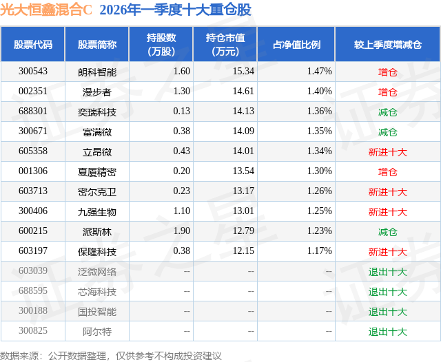 从基金规模来看,光大恒鑫混合C基金2026年一季度公布的基金规模为0.04亿元,较上一期规模555.83万元变化了-123.47万元,环比变化了-22.21%。该基金最新一期资产配置为:股票占净值比39.05%,债券占净值比20.07%,现金占净值比9.42%。从基金持仓来看,该基金当季前十大股票仓位达13.13%,第一大重仓股为朗科智能(300543),持仓占比为1.47%。