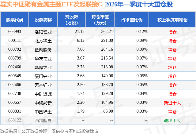 从基金规模来看,嘉实中证稀有金属主题ETF发起联接C基金2026年一季度公布的基金规模为25.3亿元,较上一期规模1.81亿元变化了23.49亿元,环比变化了1301.6%。该基金最新一期资产配置为:股票占净值比1.11%,无债券类资产,现金占净值比6.82%。从基金持仓来看,该基金当季前十大股票仓位达0.64%,第一大重仓股为洛阳钼业(603993),持仓占比为0.12%。
