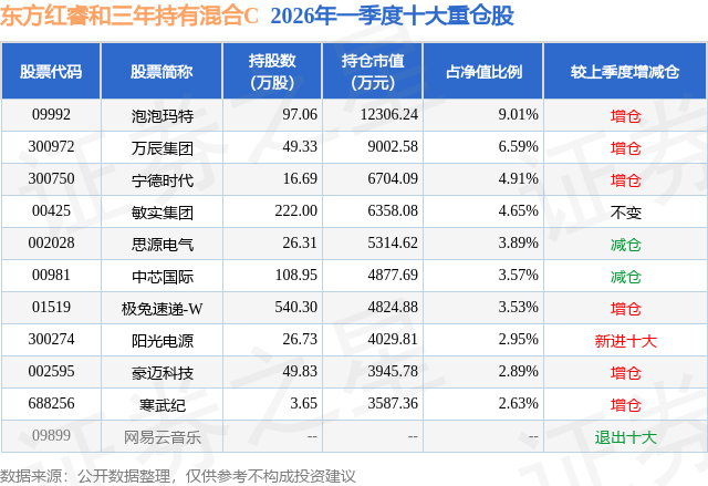 从基金规模来看,东方红睿和三年持有混合C基金2026年一季度公布的基金规模为0.3亿元,较上一期规模3683.15万元变化了-639.9万元,环比变化了-17.37%。该基金最新一期资产配置为:股票占净值比94.42%,无债券类资产,现金占净值比6.14%。从基金持仓来看,该基金当季前十大股票仓位达44.62%,第一大重仓股为泡泡玛特(09992),持仓占比为9.01%。