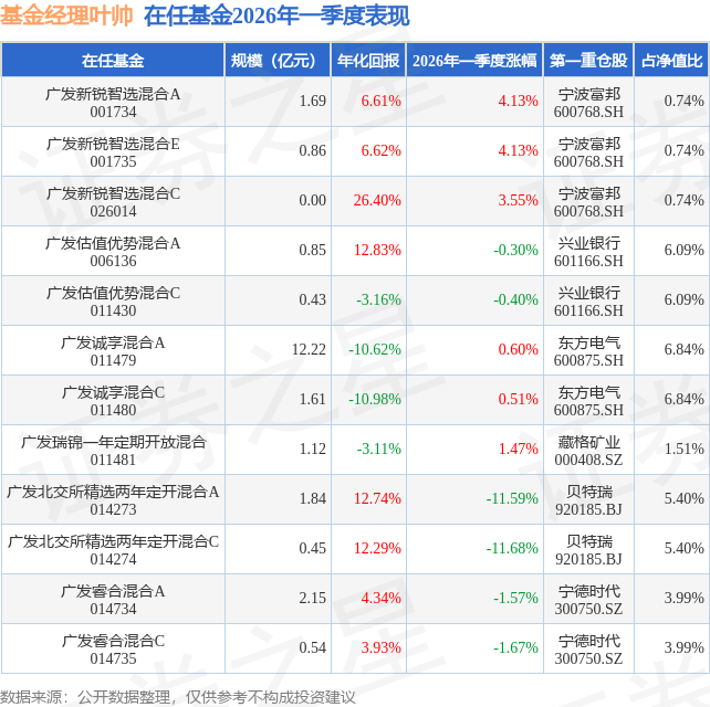 证券之星消息,日前广发北交所精选两年定开混合C基金公布一季报,2026年一季度最新规模0.45亿元,季度净值涨幅为-11.68%。
