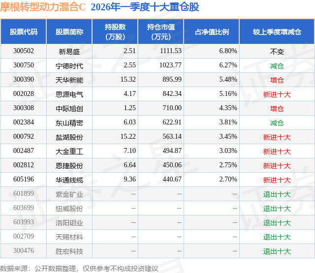 从基金规模来看,摩根转型动力混合C基金2026年一季度公布的基金规模为0.0亿元,较上一期规模19.04万元变化了-3.77万元,环比变化了-19.79%。该基金最新一期资产配置为:股票占净值比91.39%,无债券类资产,现金占净值比7.79%。从基金持仓来看,该基金当季前十大股票仓位达43.8%,第一大重仓股为新易盛(300502),持仓占比为6.8%。