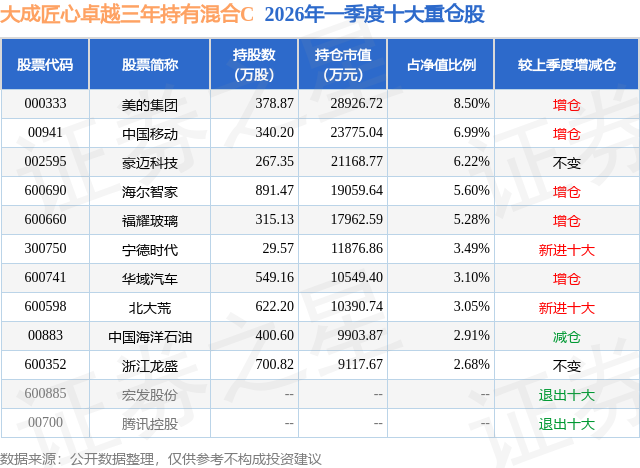 从基金规模来看,大成匠心卓越三年持有混合C基金2026年一季度公布的基金规模为2.43亿元,较上一期规模7465.43万元变化了1.69亿元,环比变化了225.9%。该基金最新一期资产配置为:股票占净值比66.8%,无债券类资产,现金占净值比33.29%。从基金持仓来看,该基金当季前十大股票仓位达47.82%,第一大重仓股为美的集团(000333),持仓占比为8.5%。