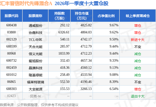 从基金规模来看,汇丰晋信时代先锋混合A基金2026年一季度公布的基金规模为4.12亿元,较上一期规模5.08亿元变化了-9608.58万元,环比变化了-18.93%。该基金最新一期资产配置为:股票占净值比94.47%,债券占净值比1.92%,现金占净值比3.93%。从基金持仓来看,该基金当季前十大股票仓位达90.14%,第一大重仓股为通威股份(600438),持仓占比为9.67%。