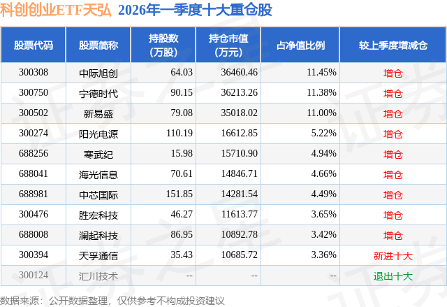 从基金规模来看,科创创业ETF天弘基金2026年一季度公布的基金规模为31.83亿元,较上一期规模26.39亿元变化了5.44亿元,环比变化了20.63%。该基金最新一期资产配置为:股票占净值比99.84%,无债券类资产,现金占净值比0.22%。从基金持仓来看,该基金当季前十大股票仓位达63.57%,第一大重仓股为中际旭创(300308),持仓占比为11.45%。