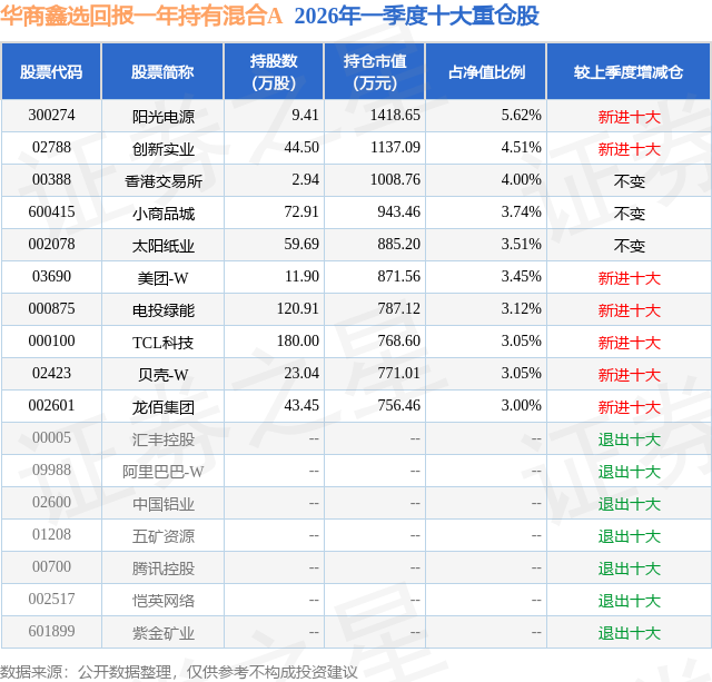 从基金规模来看,华商鑫选回报一年持有混合A基金2026年一季度公布的基金规模为2.05亿元,较上一期规模4.24亿元变化了-2.19亿元,环比变化了-51.65%。该基金最新一期资产配置为:股票占净值比88.9%,无债券类资产,现金占净值比11.6%。从基金持仓来看,该基金当季前十大股票仓位达37.05%,第一大重仓股为阳光电源(300274),持仓占比为5.62%。