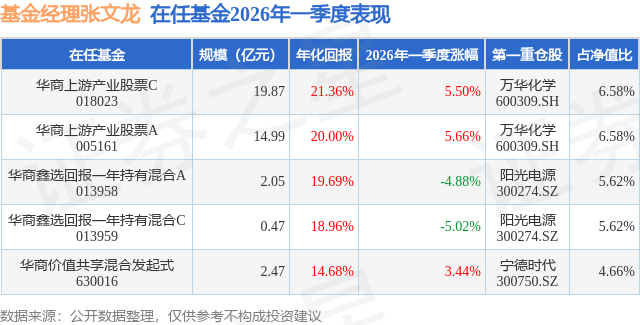 华商鑫选回报一年持有混合A现任基金经理为张文龙,本季度增聘基金经理张文龙,近期离任的基金经理为周海栋。其中在任基金经理张文龙已从业2年又263天,2025年3月12日正式接手管理华商鑫选回报一年持有混合A,任职期间累计回报为50.17%。目前还管理着5只基金产品(包括A类和C类),其中本季度表现最佳的基金为华商上游产业股票A(005161),季度净值涨幅为5.66%。