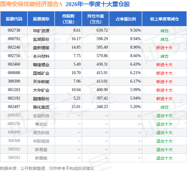 从基金规模来看,国寿安保低碳经济混合A基金2026年一季度公布的基金规模为0.32亿元,较上一期规模6296.36万元变化了-3120.84万元,环比变化了-49.57%。该基金最新一期资产配置为:股票占净值比91.6%,债券占净值比5.43%,现金占净值比2.93%。从基金持仓来看,该基金当季前十大股票仓位达72.0%,第一大重仓股为中矿资源(002738),持仓占比为9.56%。