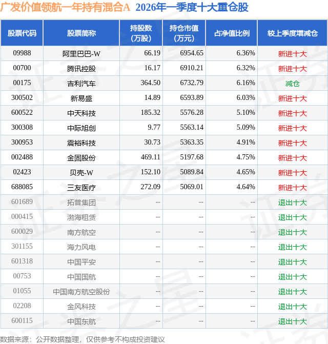 从基金规模来看,广发价值领航一年持有混合A基金2026年一季度公布的基金规模为8.89亿元,较上一期规模8962.55万元变化了7.99亿元,环比变化了891.75%。该基金最新一期资产配置为:股票占净值比91.47%,债券占净值比0.19%,现金占净值比10.81%。从基金持仓来看,该基金当季前十大股票仓位达54.01%,第一大重仓股为阿里巴巴-W(09988),持仓占比为6.36%。