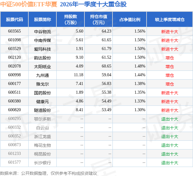 从基金规模来看,中证500价值ETF华夏基金2026年一季度公布的基金规模为0.41亿元,较上一期规模3735.21万元变化了371.89万元,环比变化了9.96%。该基金最新一期资产配置为:股票占净值比96.27%,无债券类资产,现金占净值比3.36%。从基金持仓来看,该基金当季前十大股票仓位达14.34%,第一大重仓股为中谷物流(603565),持仓占比为1.56%。