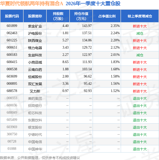 从基金规模来看,华夏时代领航两年持有混合A基金2026年一季度公布的基金规模为0.49亿元,较上一期规模1.95亿元变化了-1.46亿元,环比变化了-74.99%。该基金最新一期资产配置为:股票占净值比94.26%,无债券类资产,现金占净值比6.62%。从基金持仓来看,该基金当季前十大股票仓位达19.09%,第一大重仓股为紫金矿业(601899),持仓占比为2.35%。