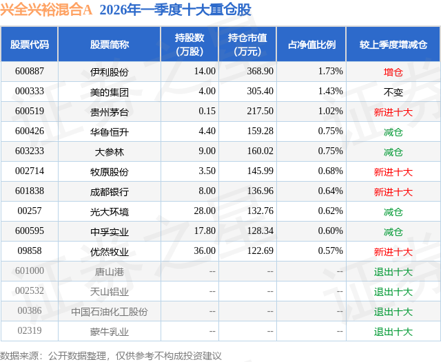 从基金规模来看,兴全兴裕混合A基金2026年一季度公布的基金规模为1.16亿元,较上一期规模4.17亿元变化了-3.01亿元,环比变化了-72.21%。该基金最新一期资产配置为:股票占净值比13.27%,债券占净值比85.19%,现金占净值比1.58%。从基金持仓来看,该基金当季前十大股票仓位达8.79%,第一大重仓股为伊利股份(600887),持仓占比为1.73%。