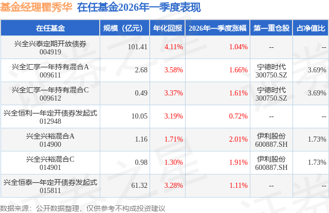 证券之星消息,日前兴全兴裕混合C基金公布一季报,2026年一季度最新规模0.98亿元,季度净值涨幅为1.91%。
