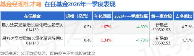 证券之星消息,日前易方达高质量增长量化精选股票C基金公布一季报,2026年一季度最新规模0.46亿元,季度净值涨幅为-4.79%。