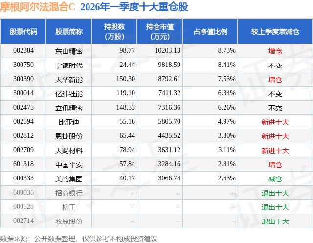 从基金规模来看,摩根阿尔法混合C基金2026年一季度公布的基金规模为0.12亿元,较上一期规模97.77万元变化了1079.26万元,环比变化了1103.92%。该基金最新一期资产配置为:股票占净值比89.41%,无债券类资产,现金占净值比10.82%。从基金持仓来看,该基金当季前十大股票仓位达54.59%,第一大重仓股为东山精密(002384),持仓占比为8.73%。