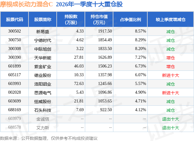 从基金规模来看,摩根成长动力混合C基金2026年一季度公布的基金规模为0.19亿元,较上一期规模38.96万元变化了1910.31万元,环比变化了4903.79%。该基金最新一期资产配置为:股票占净值比93.9%,无债券类资产,现金占净值比7.69%。从基金持仓来看,该基金当季前十大股票仓位达64.43%,第一大重仓股为新易盛(300502),持仓占比为8.57%。