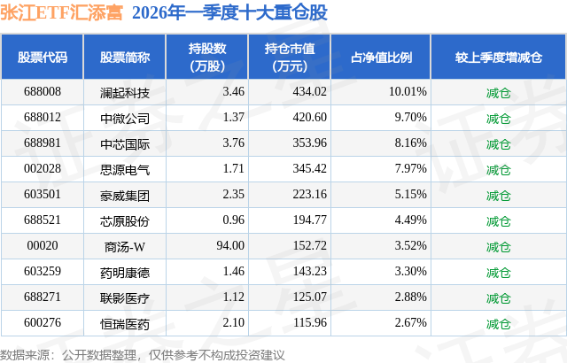 证券之星消息,日前张江ETF汇添富基金公布一季报,2026年一季度最新规模0.43亿元,季度净值涨幅为-3.35%。