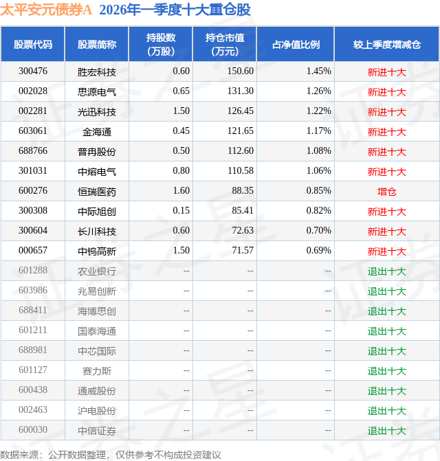 从基金规模来看,太平安元债券A基金2026年一季度公布的基金规模为1.04亿元,较上一期规模1.03亿元变化了105.58万元,环比变化了1.03%。该基金最新一期资产配置为:股票占净值比13.95%,债券占净值比99.12%,现金占净值比5.81%。从基金持仓来看,该基金当季前十大股票仓位达10.3%,第一大重仓股为胜宏科技(300476),持仓占比为1.45%。