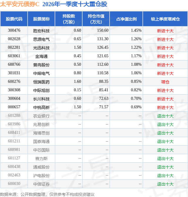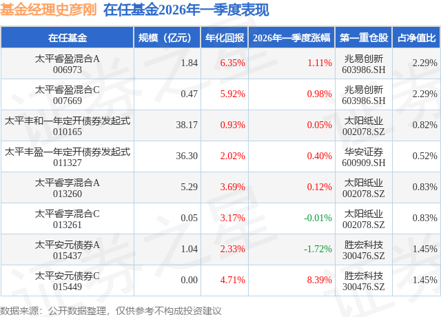 从基金规模来看,太平安元债券C基金2026年一季度公布的基金规模为0.0亿元,较上一期规模0.18万元变化了0.87万元,环比变化了476.45%。该基金最新一期资产配置为:股票占净值比13.95%,债券占净值比99.12%,现金占净值比5.81%。从基金持仓来看,该基金当季前十大股票仓位达10.3%,第一大重仓股为胜宏科技(300476),持仓占比为1.45%。