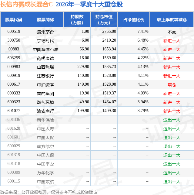 从基金规模来看,长信内需成长混合C基金2026年一季度公布的基金规模为1.09亿元,较上一期规模7.72万元变化了1.09亿元,环比变化了141501.11%。该基金最新一期资产配置为:股票占净值比89.58%,债券占净值比5.43%,现金占净值比1.49%。从基金持仓来看,该基金当季前十大股票仓位达46.73%,第一大重仓股为贵州茅台(600519),持仓占比为7.41%。