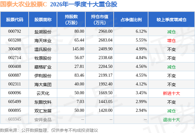证券之星消息,日前国泰大农业股票C基金公布一季报,2026年一季度最新规模0.21亿元,季度净值涨幅为0.51%。