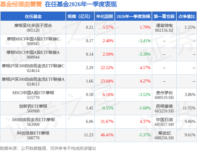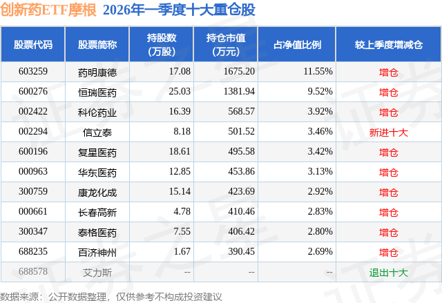 证券之星消息,日前创新药ETF摩根基金公布一季报,2026年一季度最新规模1.45亿元,季度净值涨幅为-1.6%。