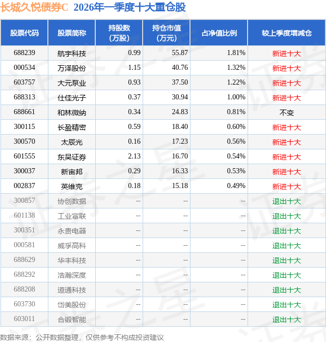 从基金规模来看,长城久悦债券C基金2026年一季度公布的基金规模为0.13亿元,较上一期规模534.2万元变化了758.38万元,环比变化了141.96%。该基金最新一期资产配置为:股票占净值比18.6%,债券占净值比83.72%,现金占净值比2.21%。从基金持仓来看,该基金当季前十大股票仓位达8.88%,第一大重仓股为航宇科技(688239),持仓占比为1.81%。