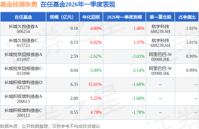 证券之星消息,日前长城久悦债券C基金公布一季报,2026年一季度最新规模0.13亿元,季度净值涨幅为1.37%。