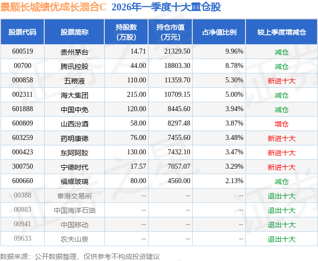 证券之星消息,日前景顺长城绩优成长混合C基金公布一季报,2026年一季度最新规模0.15亿元,季度净值涨幅为-7.13%。