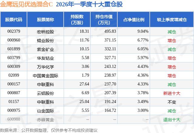 从基金规模来看,金鹰远见优选混合C基金2026年一季度公布的基金规模为0.13亿元,较上一期规模3900.5万元变化了-2644.88万元,环比变化了-67.81%。该基金最新一期资产配置为:股票占净值比92.74%,债券占净值比3.86%,现金占净值比3.94%。从基金持仓来看,该基金当季前十大股票仓位达51.22%,第一大重仓股为宏桥控股(002379),持仓占比为9.04%。