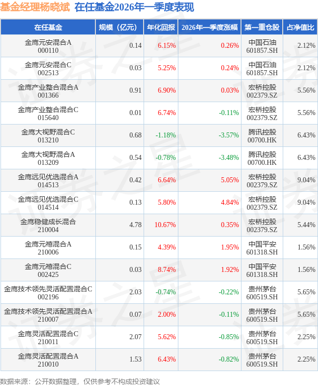 证券之星消息,日前金鹰远见优选混合C基金公布一季报,2026年一季度最新规模0.13亿元,季度净值涨幅为4.84%。