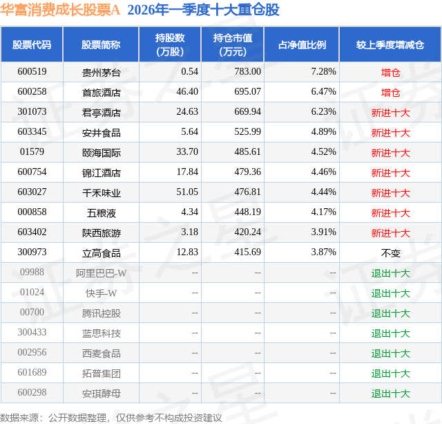 从基金规模来看,华富消费成长股票A基金2026年一季度公布的基金规模为0.91亿元,较上一期规模1.35亿元变化了-4470.13万元,环比变化了-33.01%。该基金最新一期资产配置为:股票占净值比91.65%,无债券类资产,现金占净值比6.22%。从基金持仓来看,该基金当季前十大股票仓位达50.24%,第一大重仓股为贵州茅台(600519),持仓占比为7.28%。
