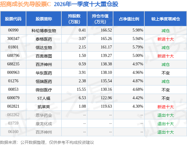 从基金规模来看,招商成长先导股票C基金2026年一季度公布的基金规模为0.04亿元,较上一期规模334.14万元变化了50.35万元,环比变化了15.07%。该基金最新一期资产配置为:股票占净值比91.58%,债券占净值比7.27%,现金占净值比3.27%。从基金持仓来看,该基金当季前十大股票仓位达50.91%,第一大重仓股为科伦博泰生物(06990),持仓占比为5.98%。