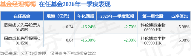 证券之星消息,日前招商成长先导股票C基金公布一季报,2026年一季度最新规模0.04亿元,季度净值涨幅为-2.9%。
