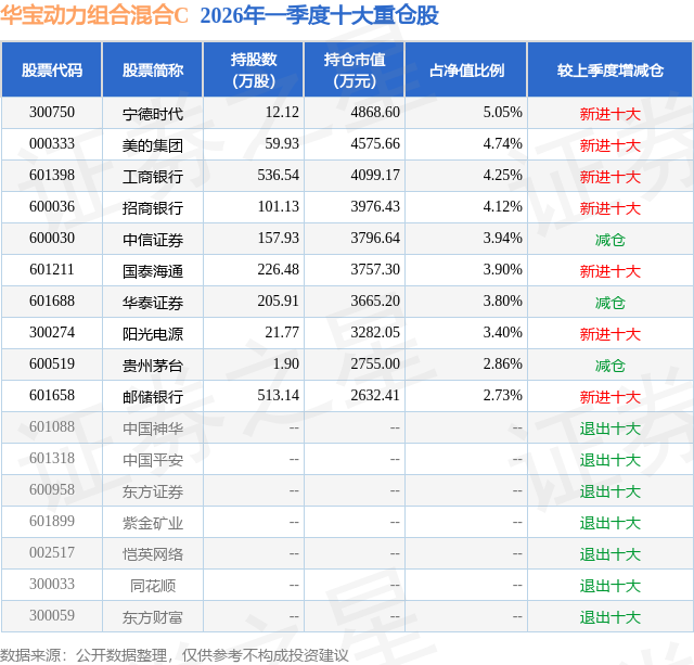 从基金规模来看,华宝动力组合混合C基金2026年一季度公布的基金规模为0.18亿元,较上一期规模5634.84万元变化了-3849.48万元,环比变化了-68.32%。该基金最新一期资产配置为:股票占净值比74.24%,无债券类资产,现金占净值比26.13%。从基金持仓来看,该基金当季前十大股票仓位达38.79%,第一大重仓股为宁德时代(300750),持仓占比为5.05%。
