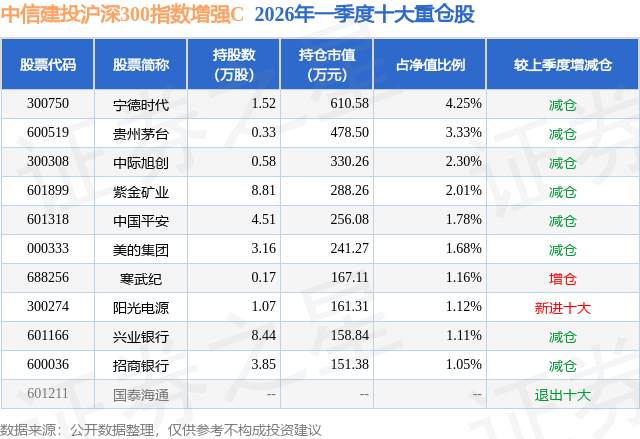 证券之星消息,日前中信建投沪深300指数增强C基金公布一季报,2026年一季度最新规模0.14亿元,季度净值涨幅为-1.93%。