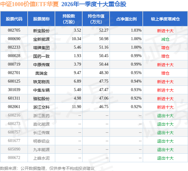 从基金规模来看,中证1000价值ETF华夏基金2026年一季度公布的基金规模为0.51亿元,较上一期规模5026.26万元变化了67.68万元,环比变化了1.35%。该基金最新一期资产配置为:股票占净值比99.0%,无债券类资产,现金占净值比1.26%。从基金持仓来看,该基金当季前十大股票仓位达9.67%,第一大重仓股为新宝股份(002705),持仓占比为1.03%。