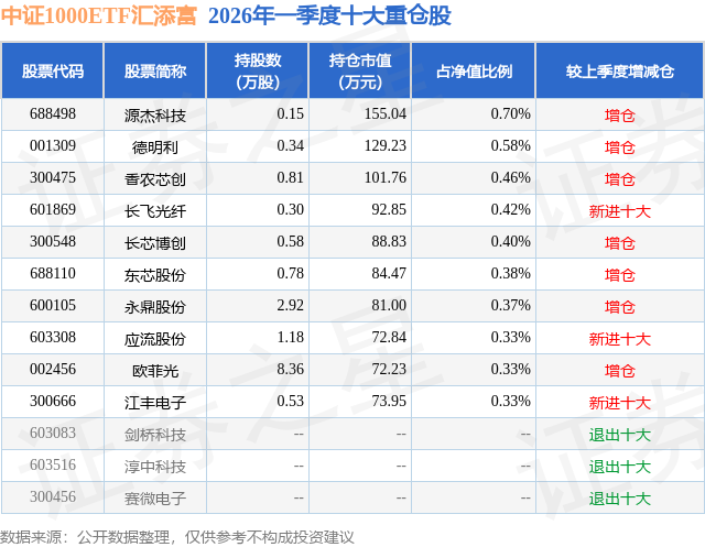 从基金规模来看,中证1000ETF汇添富基金2026年一季度公布的基金规模为2.22亿元,较上一期规模1.7亿元变化了5127.17万元,环比变化了30.08%。该基金最新一期资产配置为:股票占净值比94.57%,债券占净值比0.02%,现金占净值比5.02%。从基金持仓来看,该基金当季前十大股票仓位达4.3%,第一大重仓股为源杰科技(688498),持仓占比为0.7%。