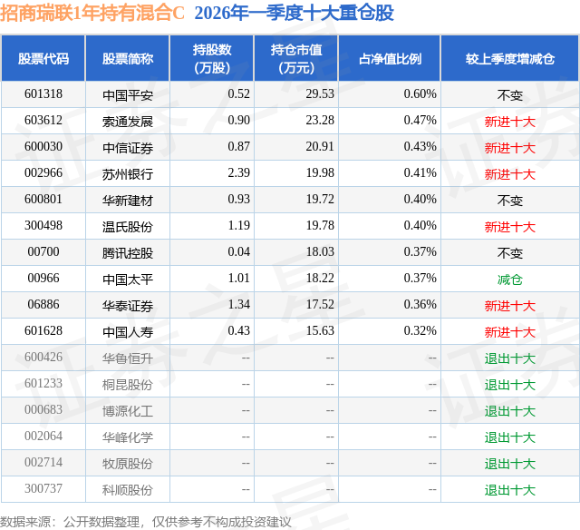 证券之星消息,日前招商瑞联1年持有混合C基金公布一季报,2026年一季度最新规模0.11亿元,季度净值涨幅为-0.12%。