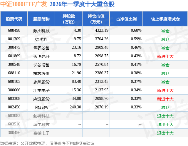 从基金规模来看,中证1000ETF广发基金2026年一季度公布的基金规模为63.27亿元,较上一期规模358.72亿元变化了-295.45亿元,环比变化了-82.36%。该基金最新一期资产配置为:股票占净值比94.86%,无债券类资产,现金占净值比4.19%。从基金持仓来看,该基金当季前十大股票仓位达4.32%,第一大重仓股为源杰科技(688498),持仓占比为0.68%。
