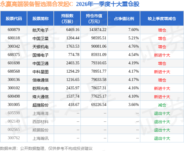 从基金规模来看,永赢高端装备智选混合发起C基金2026年一季度公布的基金规模为165.01亿元,较上一期规模1.81亿元变化了163.2亿元,环比变化了9000.51%。该基金最新一期资产配置为:股票占净值比87.15%,债券占净值比0.7%,现金占净值比12.1%。从基金持仓来看,该基金当季前十大股票仓位达46.56%,第一大重仓股为航天电子(600879),持仓占比为7.6%。