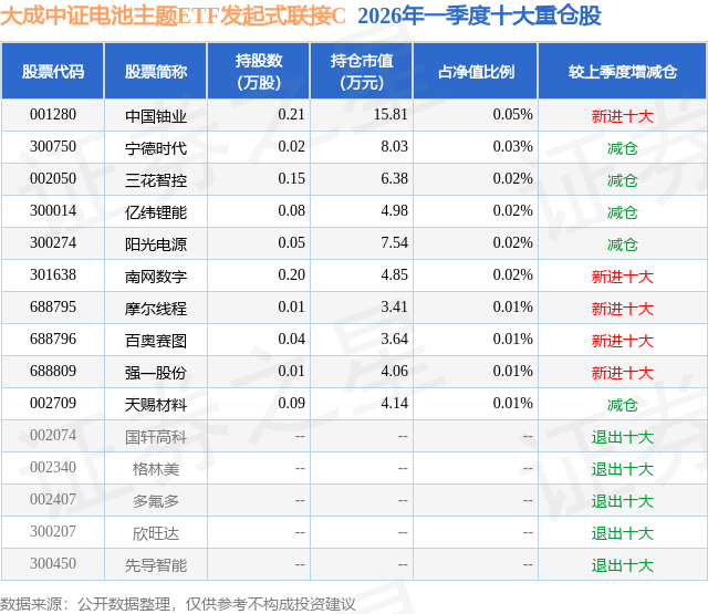 从基金规模来看,大成中证电池主题ETF发起式联接C基金2026年一季度公布的基金规模为2.36亿元,较上一期规模6988.69万元变化了1.66亿元,环比变化了238.2%。该基金最新一期资产配置为:股票占净值比0.44%,债券占净值比0.92%,现金占净值比4.7%。从基金持仓来看,该基金当季前十大股票仓位达0.2%,第一大重仓股为中国铀业(001280),持仓占比为0.05%。