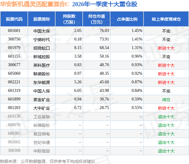 从基金规模来看,华安新机遇灵活配置混合C基金2026年一季度公布的基金规模为0.03亿元,较上一期规模47.68万元变化了279.5万元,环比变化了586.22%。该基金最新一期资产配置为:股票占净值比21.09%,债券占净值比51.73%,现金占净值比27.86%。从基金持仓来看,该基金当季前十大股票仓位达9.83%,第一大重仓股为中国太保(601601),持仓占比为1.45%。